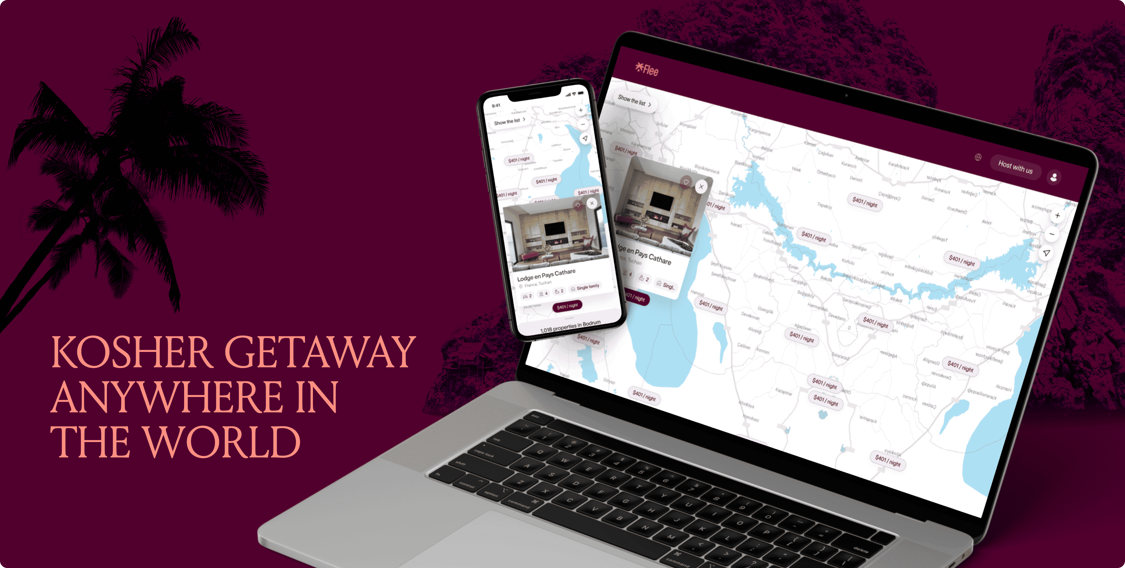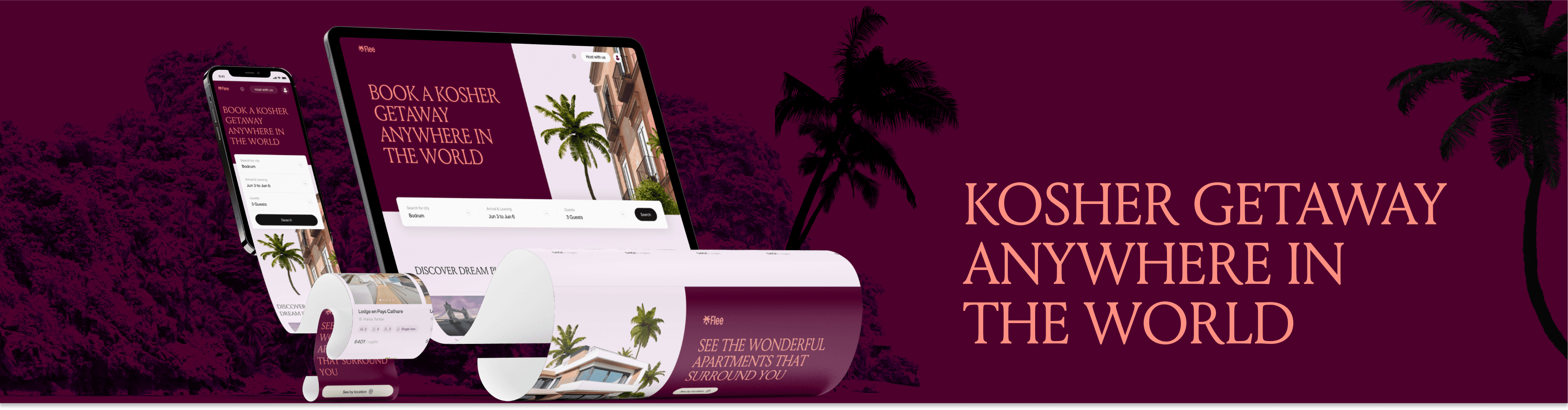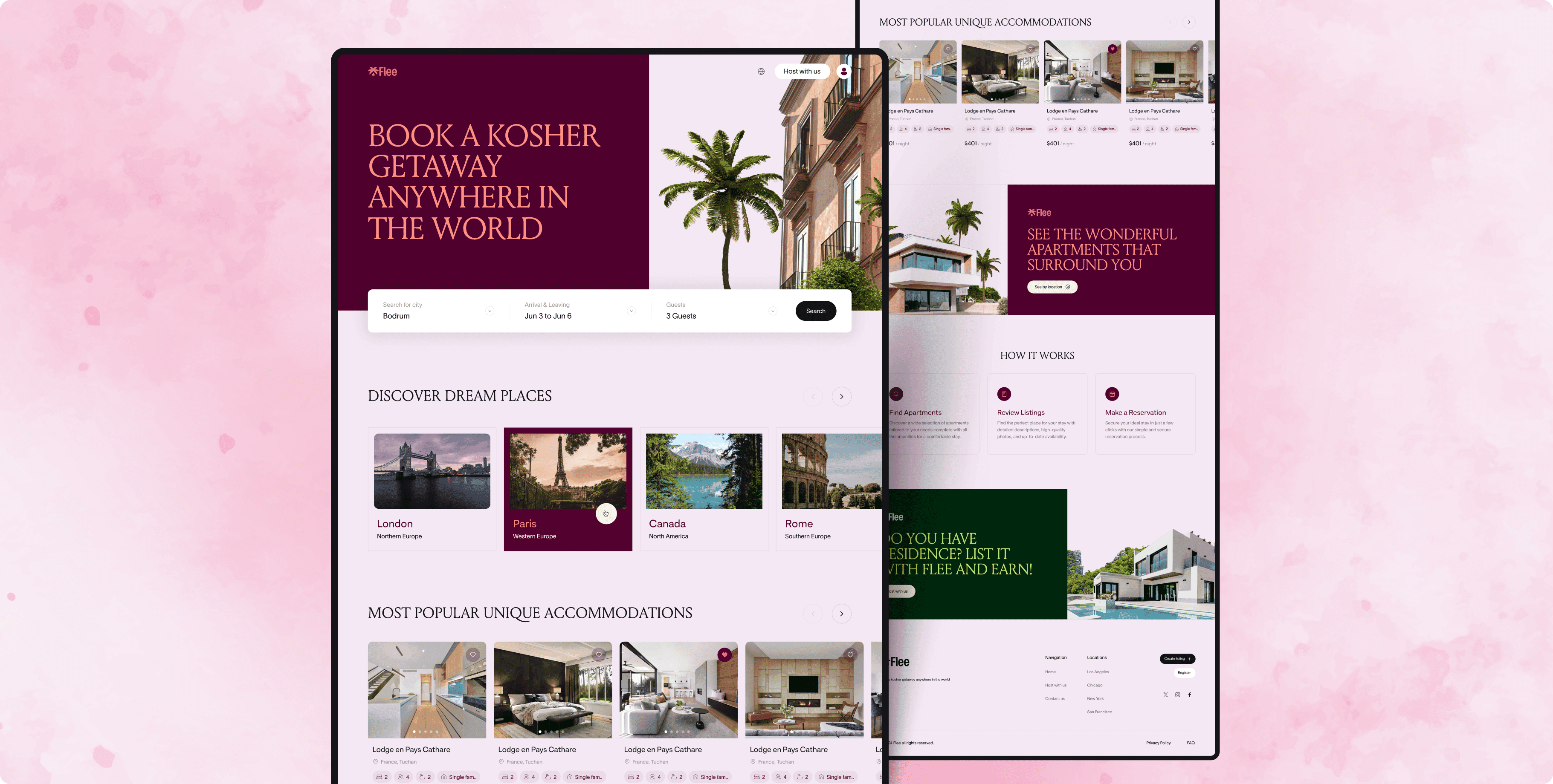 Flee is an online booking platform dedicated to kosher-friendly travel. Users can choose a city, set their travel dates, and select the number of guests to instantly receive a tailored list of accommodations that match their cultural and lifestyle needs. The design blends a modern visual style with intuitive search and filtering tools, ensuring a smooth and convenient booking experience on both mobile and desktop devices