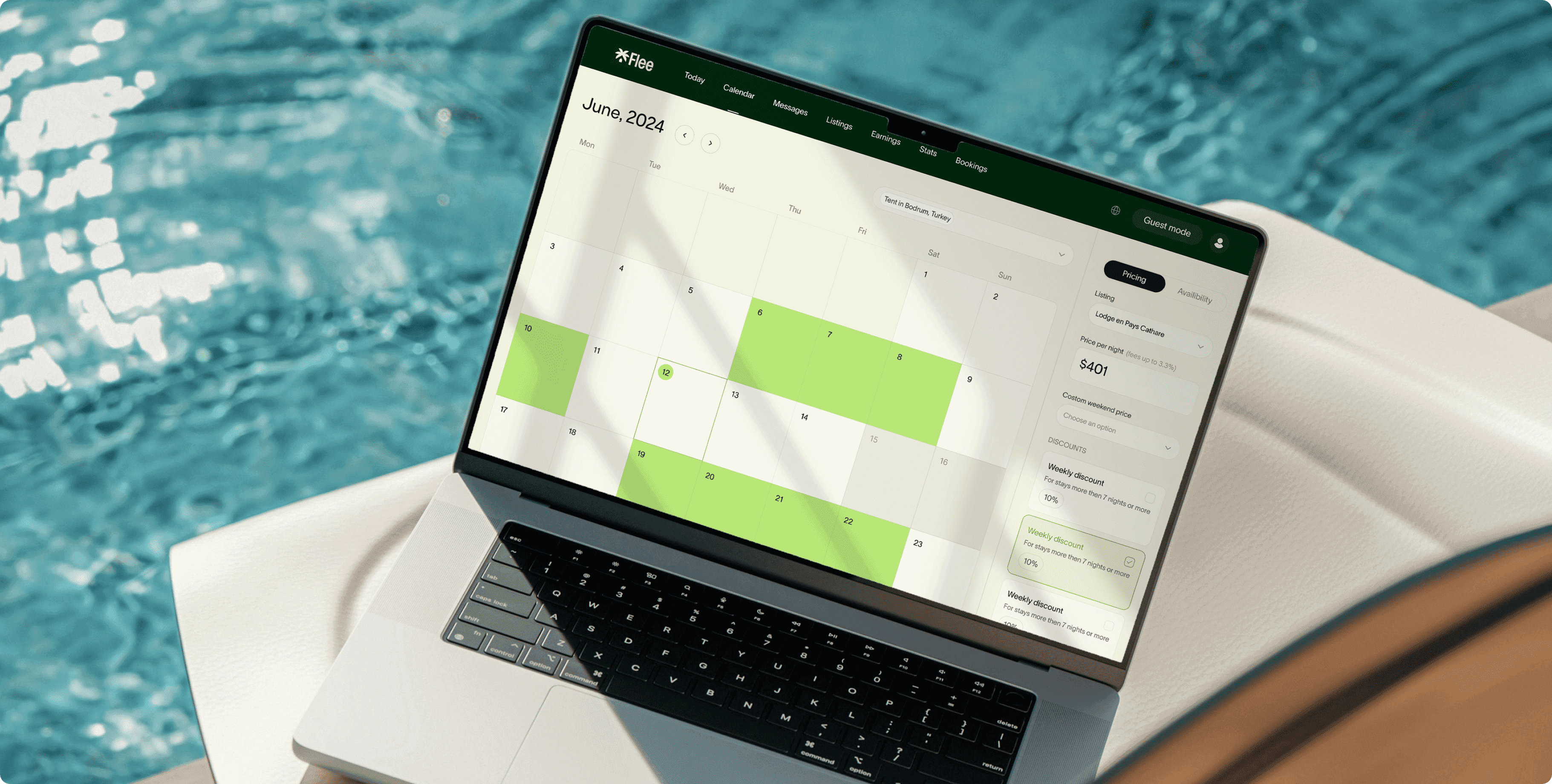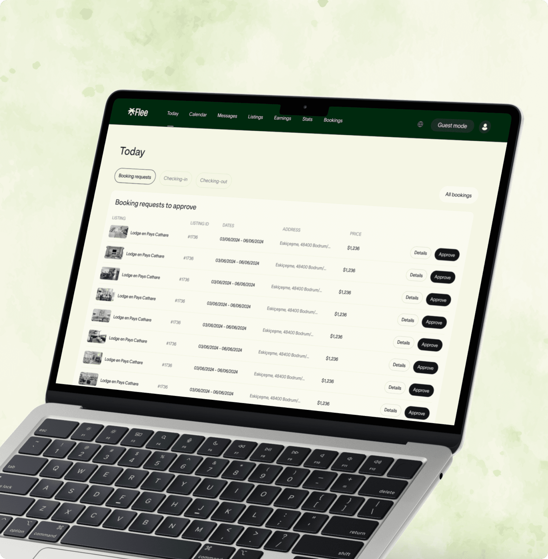 Designed the host management dashboard to give property owners full control over bookings and availability in one intuitive space. The “Today” view presents booking requests in a clean table format, showing property details, dates, location, price, and quick action buttons to approve or view more information. This makes it easy to process multiple requests without losing track. The integrated calendar view provides a clear visual of upcoming stays, available dates, and pricing, with options to adjust rates, set minimum stays, and apply discounts directly from the sidebar. The consistent navigation and responsive design ensure hosts can manage their listings efficiently on any device, streamlining daily operations and maximizing occupancy.