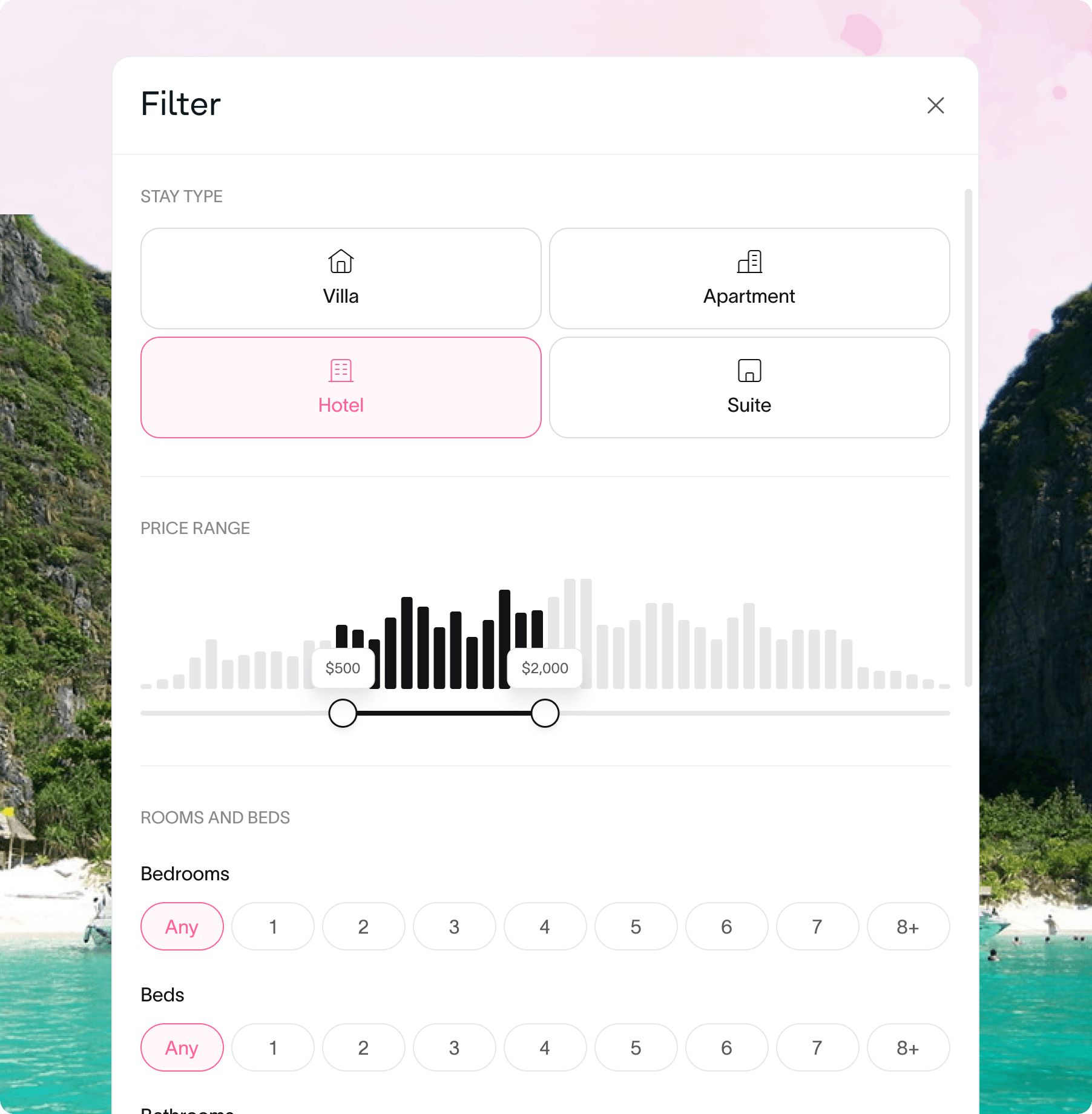 Was created the booking experience to make searching, filtering, and selecting properties effortless across devices. The filter panel allows users to refine results by stay type—Villa, Apartment, Hotel, or Suite—and adjust the price range with an intuitive slider. Results are displayed in a clean grid layout with high-quality images, nightly rates, and key amenities clearly shown. A map view offers a geographic perspective, enabling users to see prices and availability across the region, both on mobile and desktop.