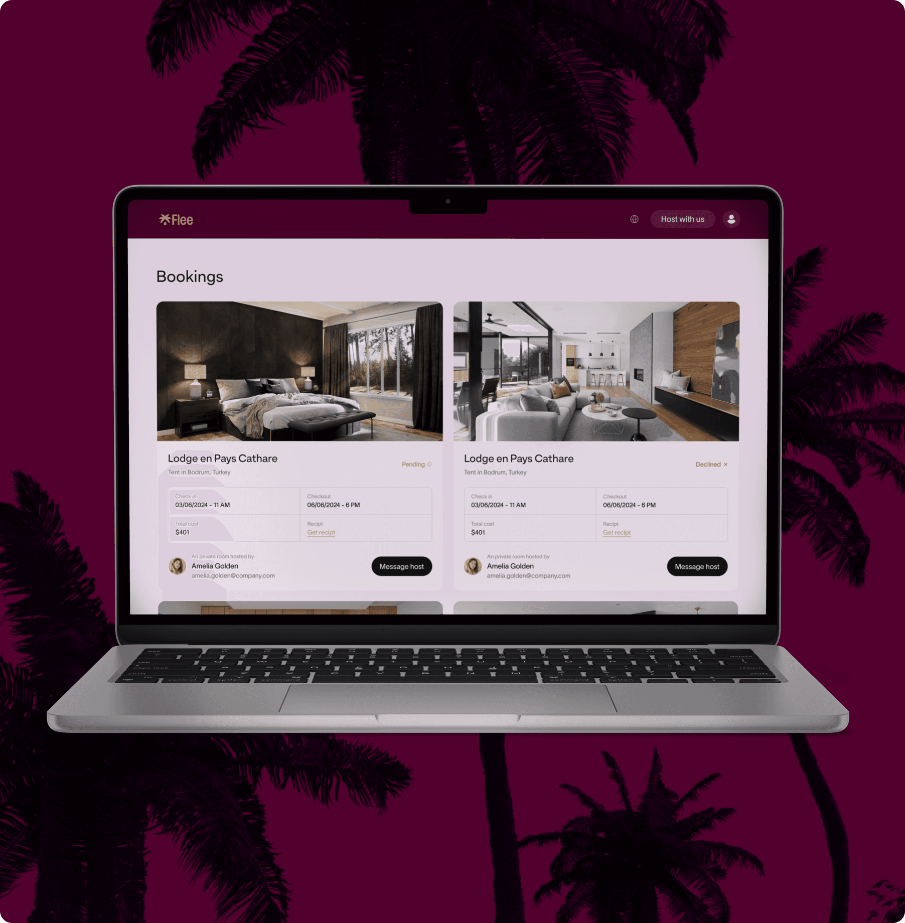 Was designed the bookings dashboard to make managing stays simple and transparent. Reservations are displayed in a clean card layout with key details—property, dates, price, and status—visible at a glance. Clear labels and “Message host” buttons enable quick communication, while the fixed menu offers instant access to messages, settings, and support. Through the main menu, users can message property owners directly, adjust their profile settings, and quickly contact customer support. This ensures smooth communication, easy personalization, and fast issue resolution.