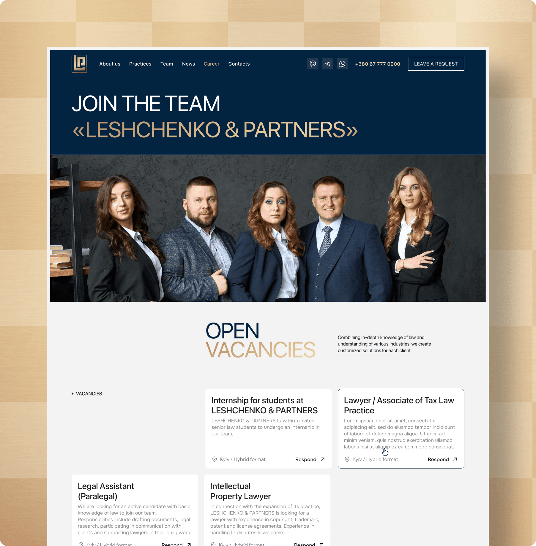 A page where you can view open vacancies. All you need to do is click “Respond”, provide your contact information, attach your resume - and you are one step closer to becoming part of the Leshchenko & Partners team.